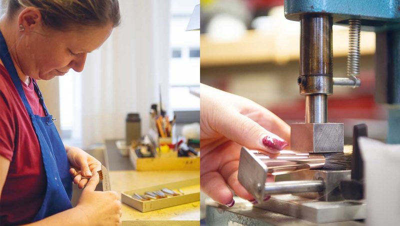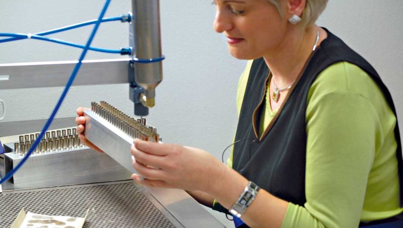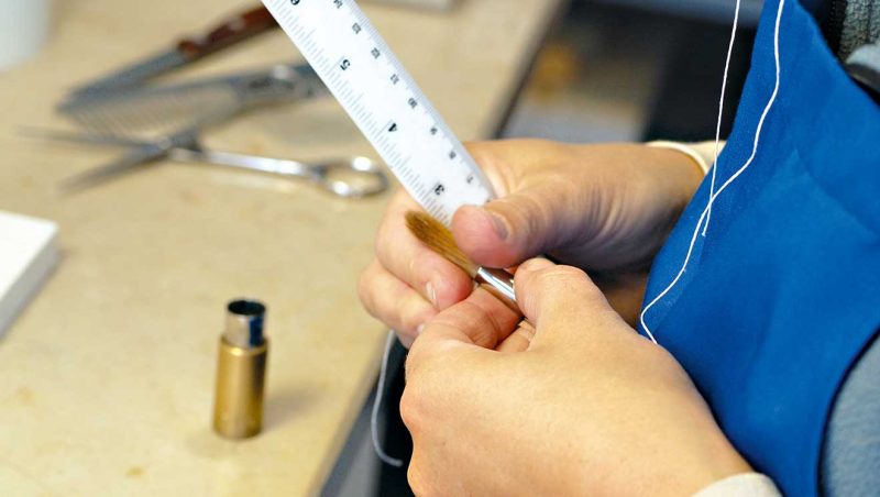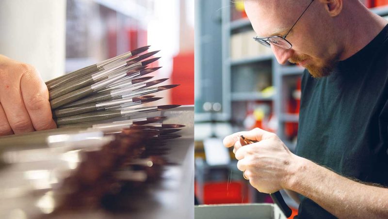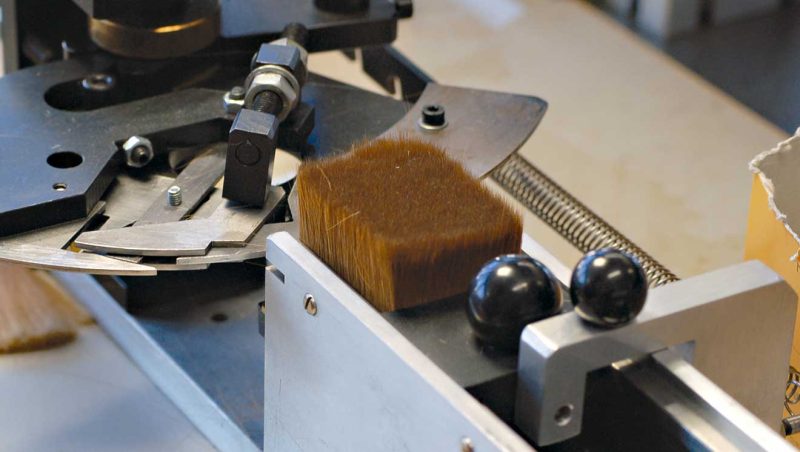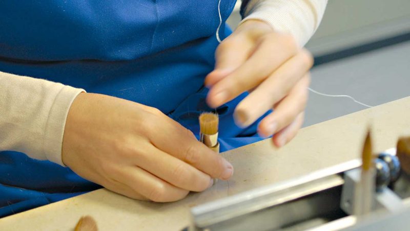 Việc gắn lông cọ vào ống nối được thực hiện bằng máy định lượng. Ống nối được đổ đầy keo hai thành phần hiện đại. Sau quá trình sấy khô, tất cả các sợi lông được cố định chắc chắn. Sau đó, các máy khác sẽ thực hiện công việc của chúng: Tay cầm và ống nối được ép lại với nhau, kích thước và tên công ty được đóng dấu lên tay cầm. Tại da Vinci, chúng tôi đã chế tạo máy của riêng mình để đảm bảo các quy trình này được thực hiện theo đúng thông số kỹ thuật của chúng tôi.