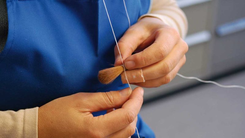 Sau khi lấy được lượng tóc cần thiết ra khỏi hộp đồng thau, chùm lông được luồn vào một vòng sợi cotton và xoắn giữa các đầu ngón tay để chúng nhanh chóng được cố định lại và có được hình dạng cuối cùng tuyệt đẹp. Ngay sau đó, các sợi lông sẽ bung ra theo đúng hình dạng ở giai đoạn này. Người thợ làm cọ nhanh chóng sửa hình dạng này bằng cách xoay sợi chỉ một lần nữa và siết chúng trong khi đầu sợi chỉ còn lại được giữ chặt bằng răng.